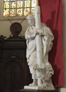 Keep this in your memory for a moment: there is the full light on the face of the apostle, still preaching while looking up to heaven; then there are the athletic executioners, the proconsul Ageas on horseback and then his wife – converted to Christianity ‑ with their children; she looks at us. And then there is the little dog. When standing face to face with Rubens’ s famous ‘Raising of the Cross’ in the Cathedral of Our Lady, you will notice striking similarities!