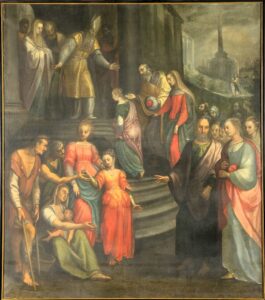 Revenons à l’ œuvre et à l’utilisation de la couleur. Les couches de vernis ont assombri la fraîcheur d’origine. Une restauration permettrait peut-être de raviver les couleurs fanées . La composition se conforme aux méthodes de travail de la fin du 16e siècle: les principaux personnages au premier plan, le thème central au milieu et sur fond gris un aperçu de l’histoire de Joachim et Anne à la Porte d’Or à Jérusalem. Un tel tableau raconte encore plusieurs chapitres d’une même histoire en toile de fond: plus tard, à l’époque du baroque, il n’y aura plus qu’une seule cover-story.